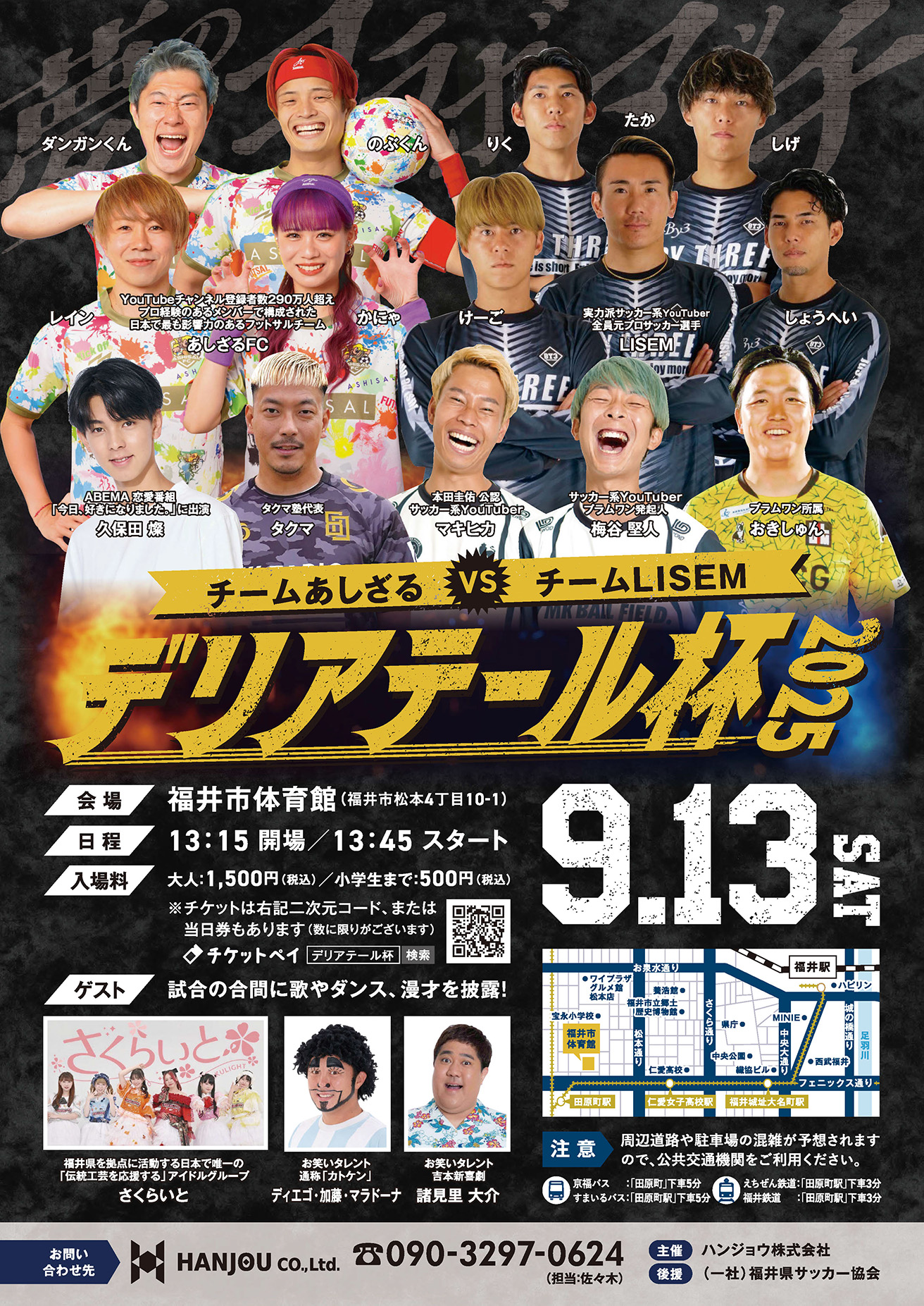 今年も⼈気YouTuber達が福井に⼤集結し、ハンジョウ株式会社主催のフットサル⼤会「デリアテール杯」が開催されます!!